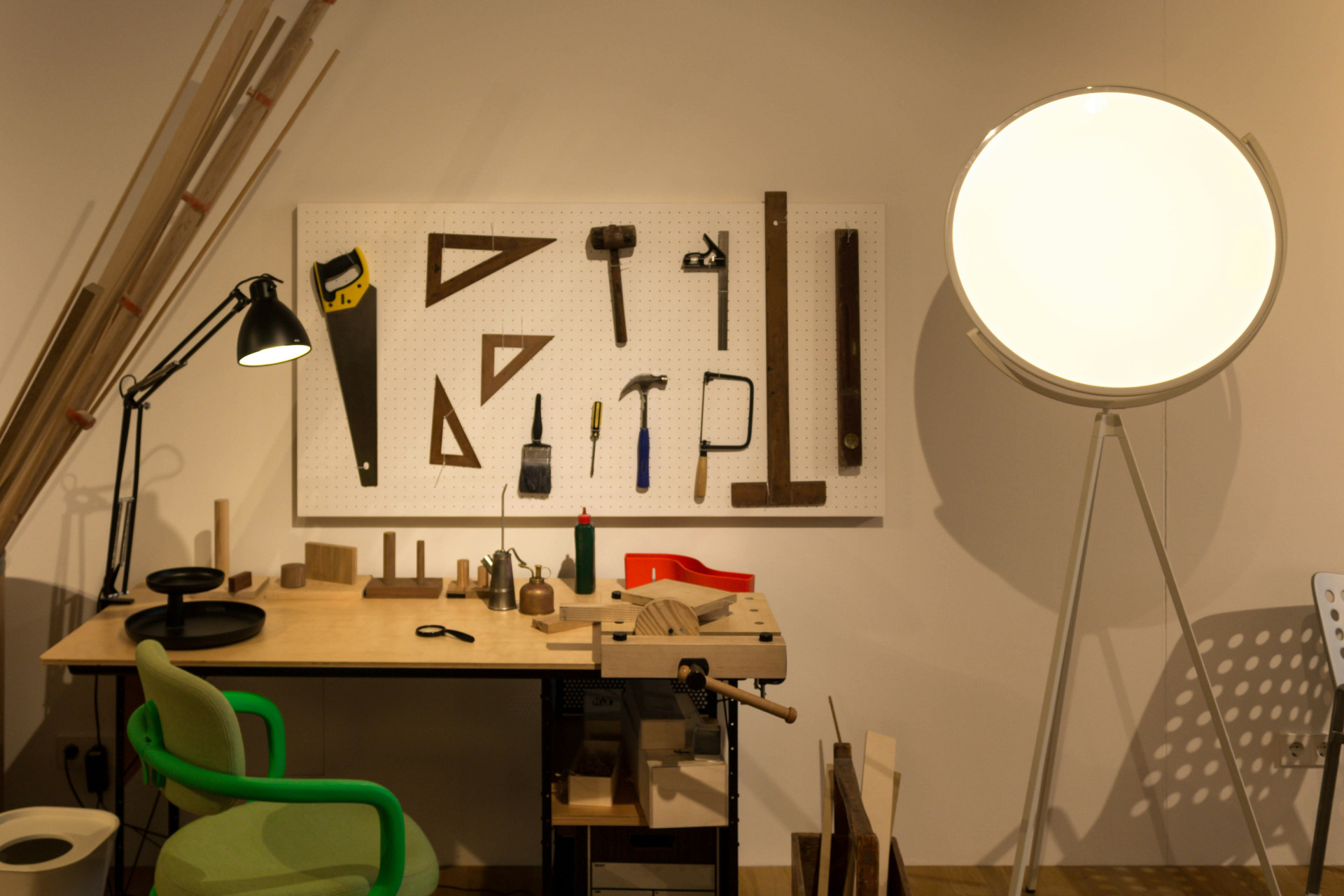 Gerade in kleineren Räumen ist die Wandfläche oft ungenutzt. Bringe Regale, Lochplatten oder Magnetleisten an, um Werkzeuge, Pinsel, Scheren oder Garnrollen griffbereit aufzuhängen. Auch Hakenleisten oder Wandkörbe sind praktisch, um häufig genutzte Dinge schnell zur Hand zu haben.